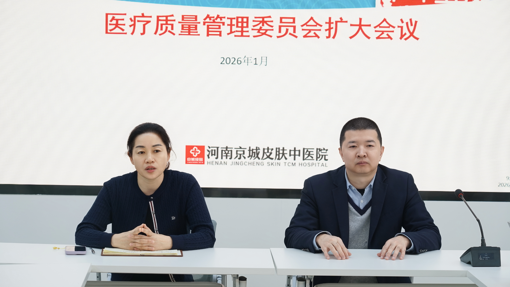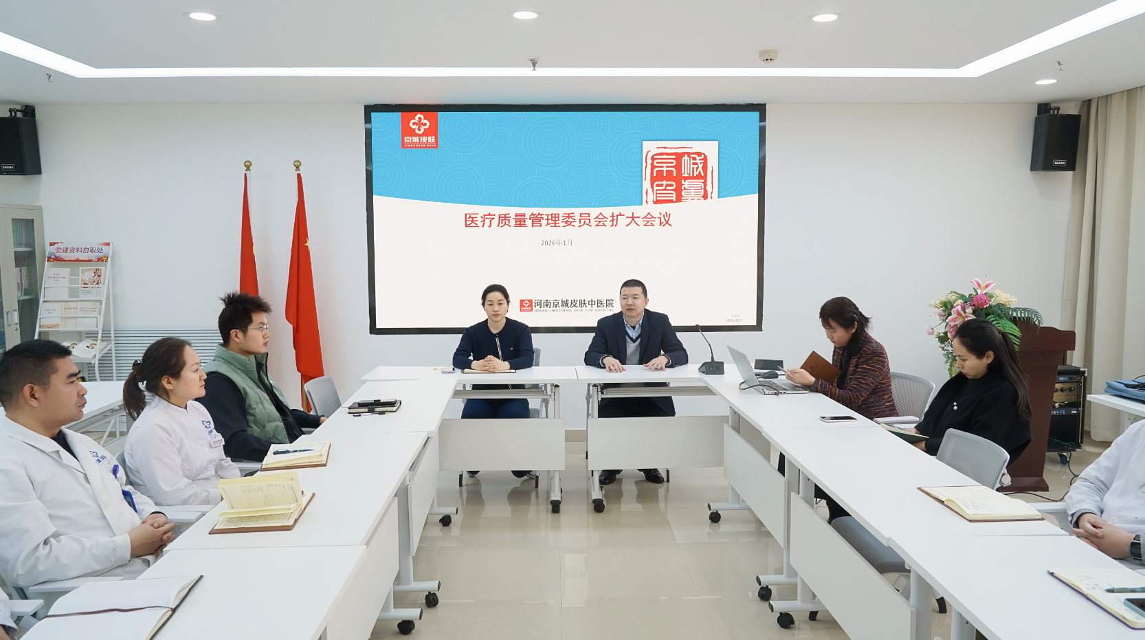 今日上午,河南京城皮肤中医院召开医疗质量管理委员会扩大会议,总经理林庆阳、行政院长聂荣芳、医务部主任王景萍及各科室负责人齐聚一堂,以医疗质量提升与安全管理为核心,复盘过往成效、部署下一阶段重点任务,凝聚全员共识筑牢诊疗安全防线。